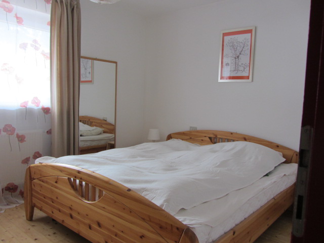 - Schlafzimmer mit einem Doppelbett und großem Kleiderschrank